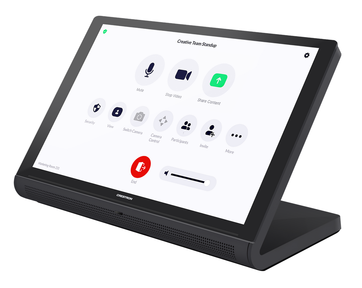 With a large 10.1 in. (257 mm) capacitive touch screen display, the Crestron® tabletop touch screen (TS‑1070) provides superior conferencing control in meeting rooms, huddle spaces, and executive offices. The touch screen also offers optional control of room lighting, shades, thermostats, and other equipment.2