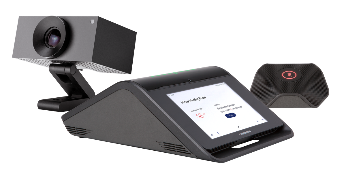 - Complete kit contains the Crestron Flex tabletop conferencing device, AI collaboration camera, mic pod, cables, and power supply