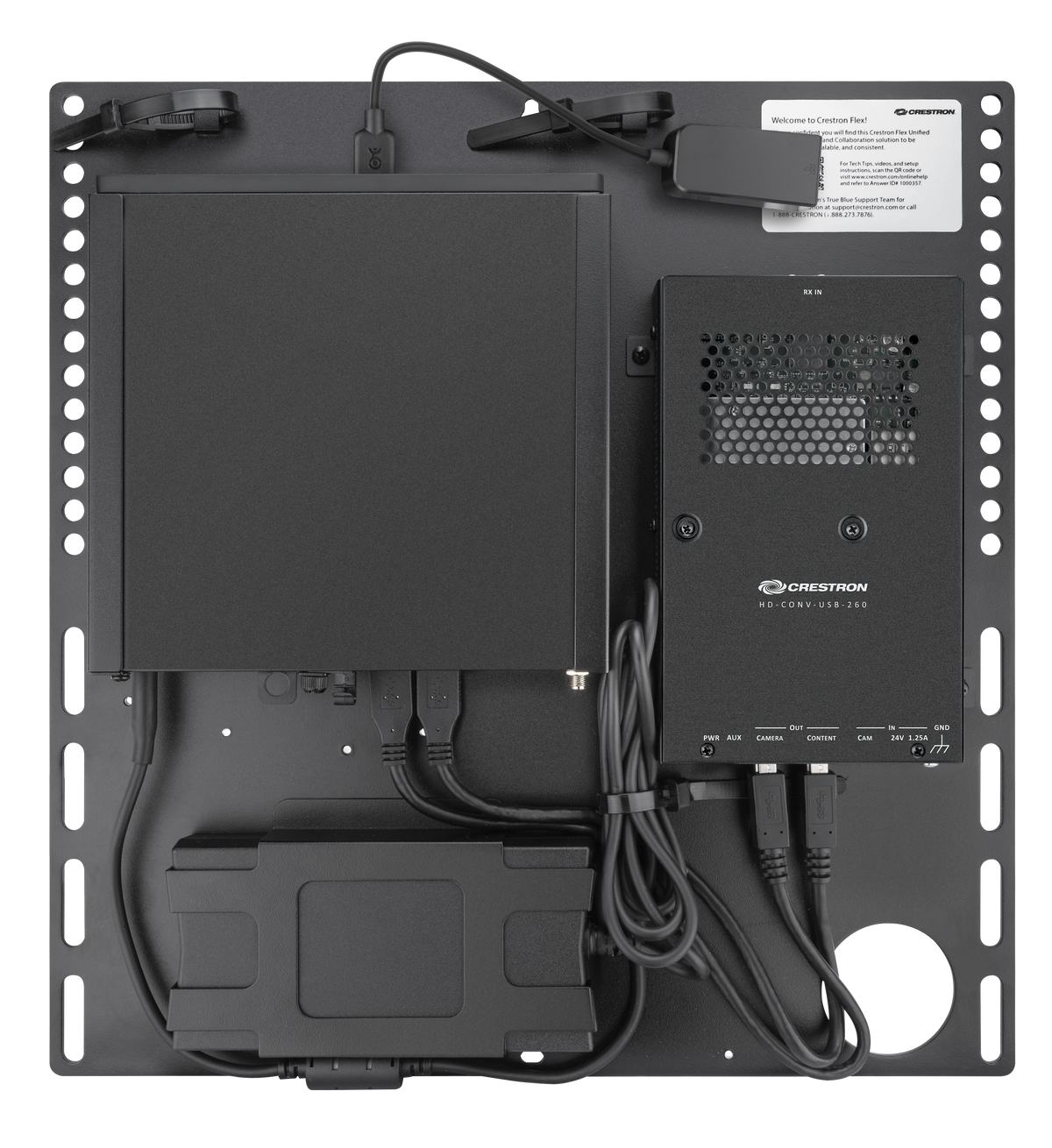 To simplify installation, the UC Bracket Assembly provides preassembled components on one ready-to-mount bracket. The assembly can be mounted on a wall, or it can be attached to the rear of the display device. Crestron's direct connection method further simplifies installation with a single connection from the Crestron Flex tabletop conference device to the UC Bracket Assembly.2